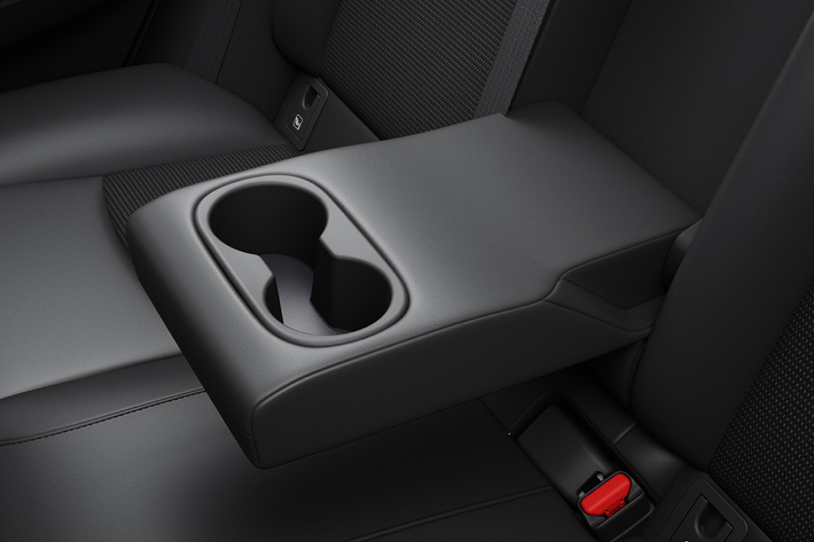 膝まわりに十分なスペースを確保し、座り心地にこだわったリヤシート。2段階のリクライニング機構を採用しており、ゆったりとリラックスした姿勢でくつろげます。また、収納式のリヤアームレストは肘置きとしても、カップホルダーとしても利用可能です。